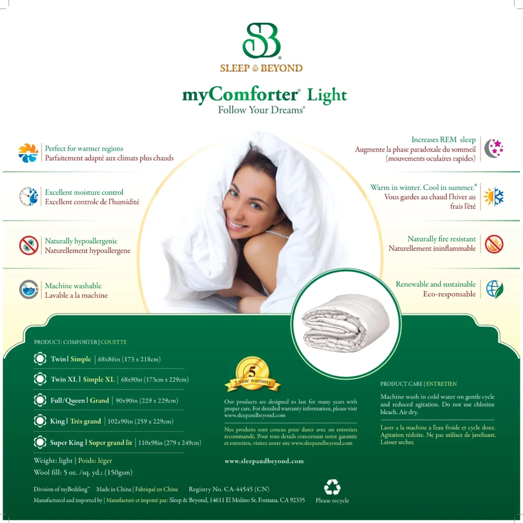 100% All-natural washable wool comforter helps to regulate your body temperature and wick away moisture. So, you spend less time tossing and turning, and more time experiencing the deep relaxation your body craves.
