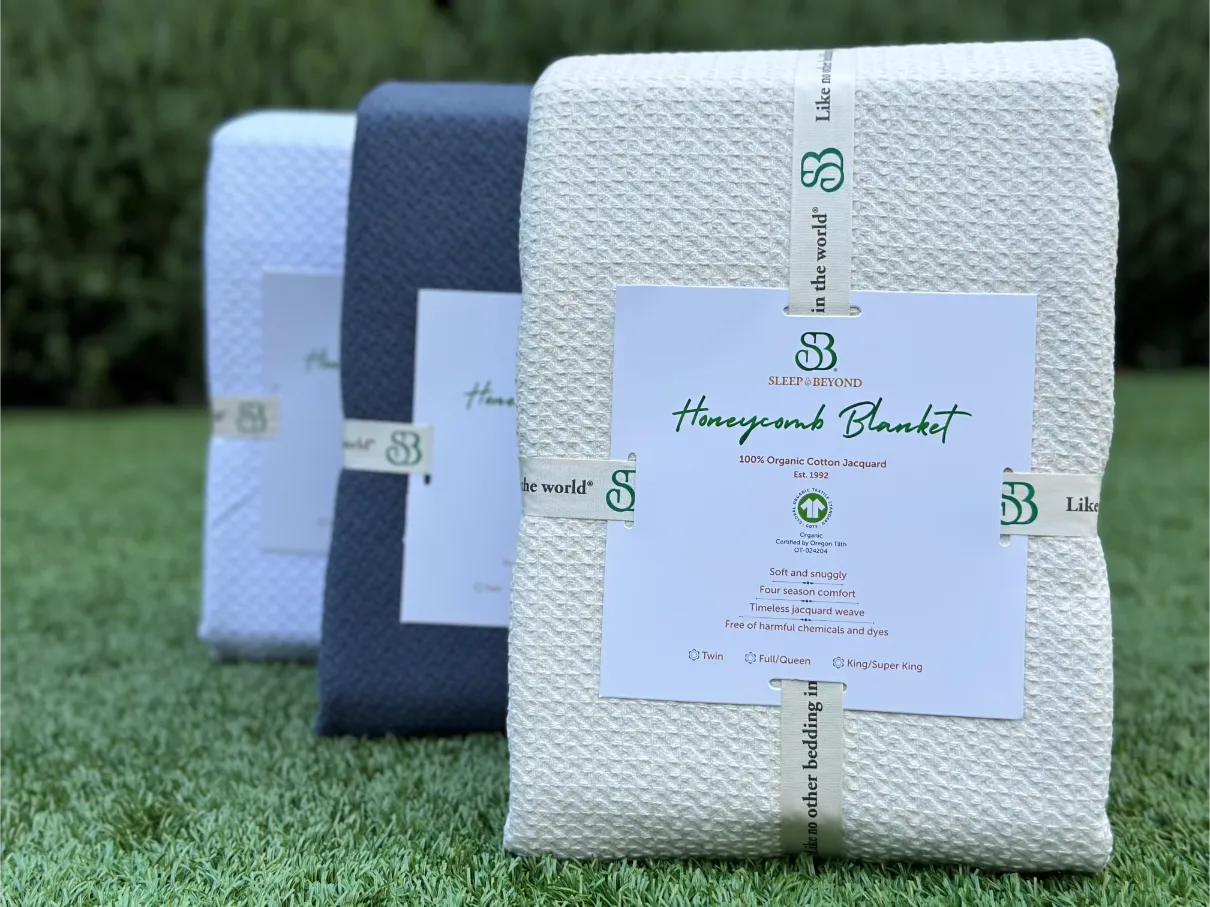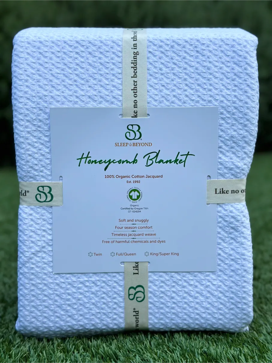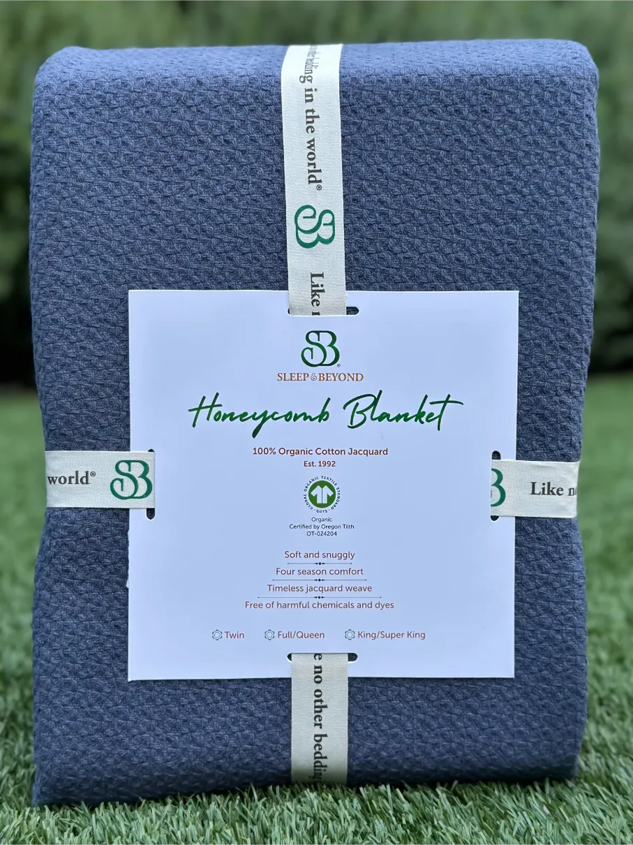 Our 100% Organic Cotton Honeycomb Jacquard Blankets can be machine washed in cold or warm water on the gentle cycle with like colors. Use natural, plant based laundry detergent. Air dry or tumble dry on low heat and remove promptly. Use warm iron as needed. Use only non-chlorine bleach, if needed. Eco-friendly dry clean.