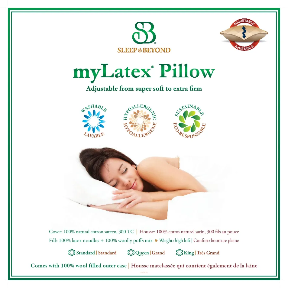 Our classic 100% natural and adjustable latex pillow. Filled with an equal mix of 100% latex noodles and 100% soft and springy washable woolly puffs. Cover: unique wool filled and cotton quilted pillow case. Cover fabric: 100% natural cotton sateen, 300TC, ivory. Cover fill: 100% washable wool, 5 oz per sq. yd. (150gsm). Ships in firm fill for easy weight adjustment. Fill power: 102 oz/sq. yd.