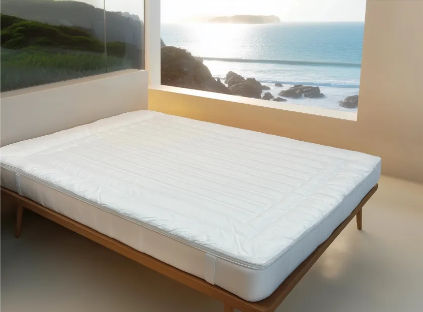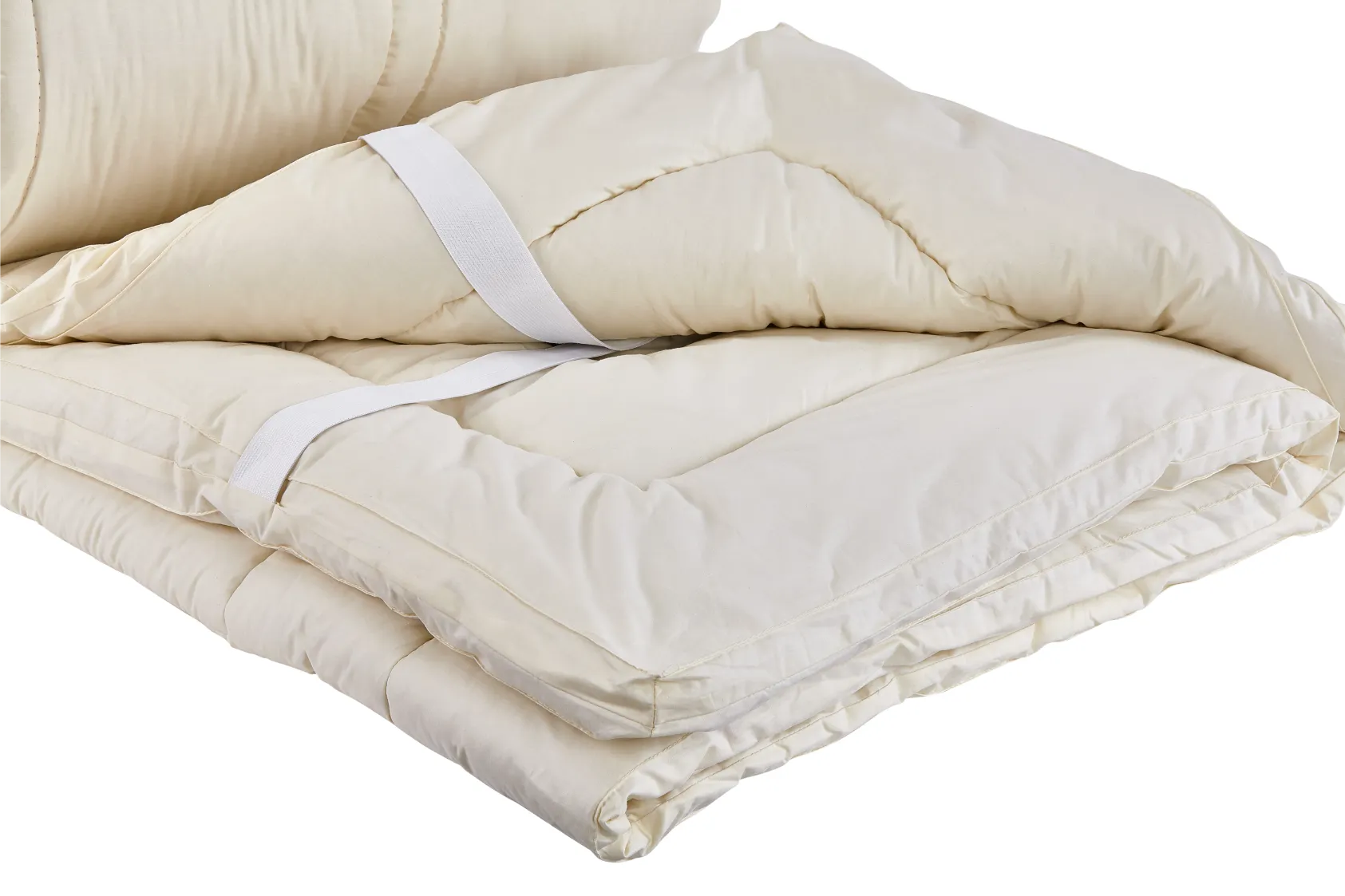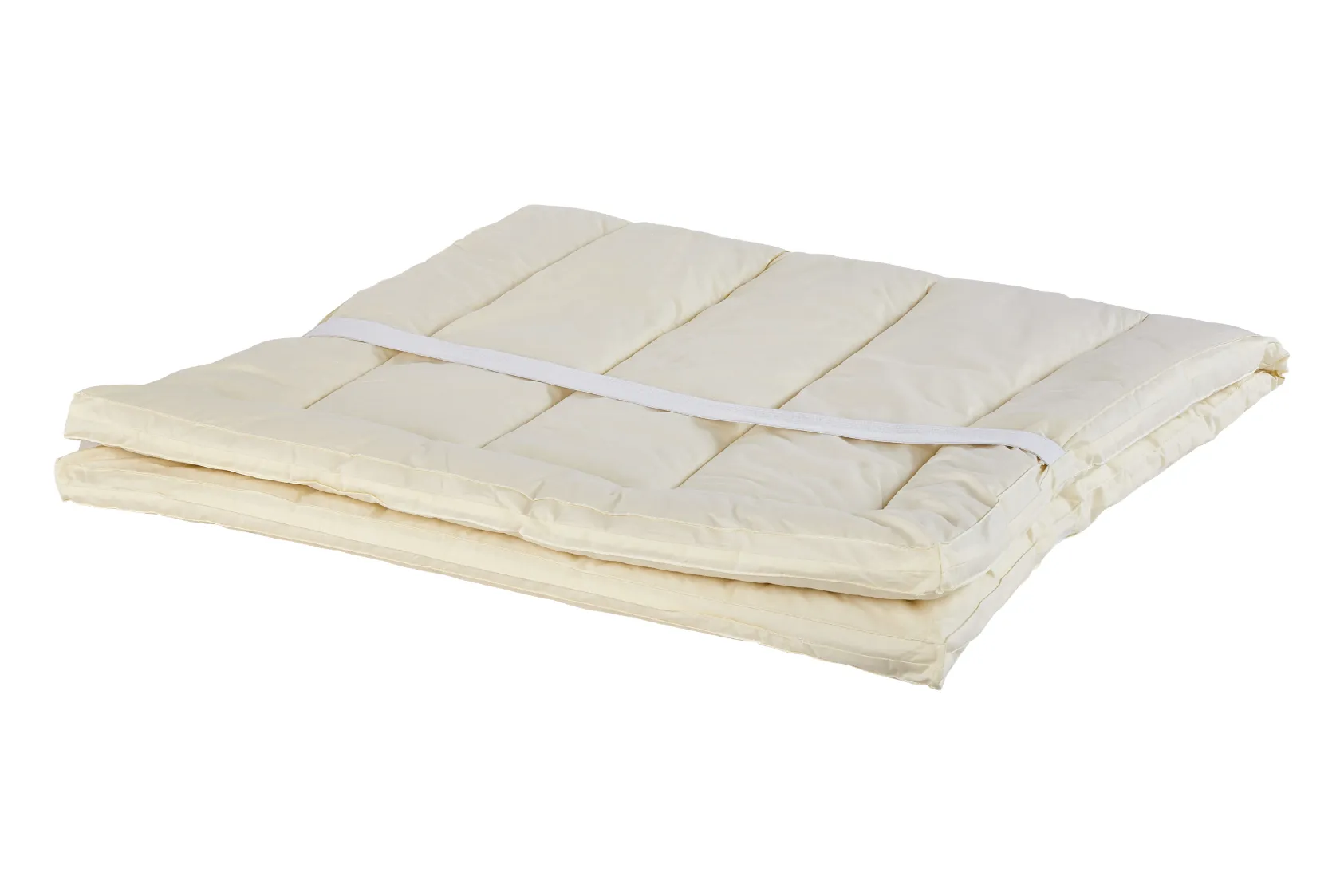 Mattress pad with elastic straps. Loft: 0.5″ thick. Fill power: 17 oz per sq. yd. (750 gsm)